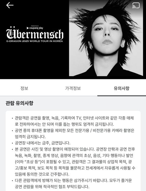 - 예능방송·미디어Q. GD 콘서 트 질문이요!!! 빨리 답주시며누좋아오제가 콘서트가 처음이라 궁금한게 많아요...만약에 선예매에서 사람들이 표를 다 사면 일반예매에서는 살수있는게 없는건가요?유의사항에 이렇게 나와있는데 그럼 사진이나 영상이 촬영이 불가한가요????????