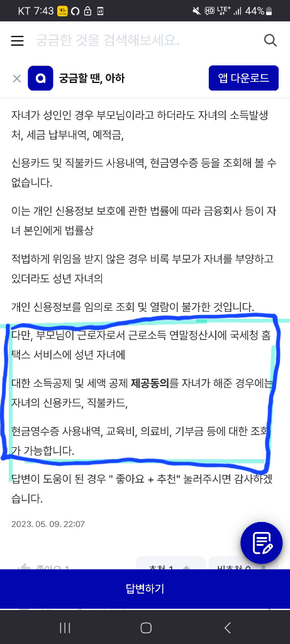 - 종합소득세세금·세무Q. 부모가 자녀의 카드 내역 조회하는 것을 막는방법 제공동의를 언제인가 했는지, 부모님이 제 지출 금액을 알 수 있더라고요.질문1. 제공동의를 취소하고, 조회하지 못하게 하는 방법이 있나요?2. 취소 하는 경우, 제가 직접 하게 될 국세청 업무는 뭐가 있을까요? 근로소득은 아직 없습니다3. 취소 하는 경우, 받게 되는 불이익이 있나요?(예를 들어, 현금영수증 집계가 따로 되면서 낮게 잡힌다던가... )아는 게 전혀 없어서 뭐라 설명하기가 어렵네요. 어떤 형태로든, 금액적으로 손해 보는 일이 생기나요?