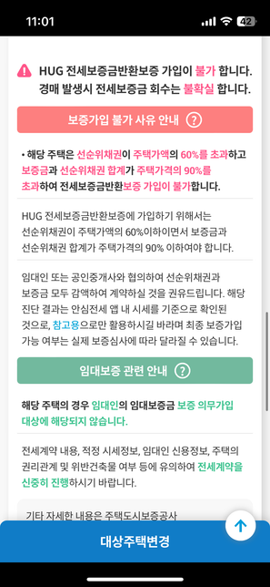 - 부동산·임대차법률Q. 법인명의 연립주택 전세, hug보증보험 불가 건물 문의합니다.연립주택 명의는 법인 단독소유인데 전세로 들어가려하는데 안전한지 어떻게 알수잇을까요 ?전세금이 7천만원이라서 보증보험을 가입하고싶은데Hug안심전세 어플에서 안심진단해보니 보증보험 가입불가라고 나오는데 HF나 SGI도 가입불가일까요?건물 등기부등본 조회하면 근저당 18억,,,법인 명의이긴한데 각 호수별로 주인?이 다르다고만 들었습니다. 계약을 하지말아야할까요?계약할 호수도 계약일날 말해준다고해서 등기부등본을 정확히 떼지못했습니다..아래는hug전세보증보험 불가 사유입니다
