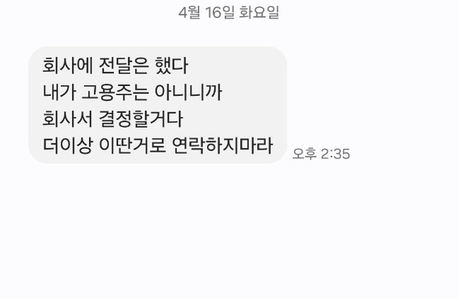 - 임금·급여고용·노동Q. 이런거 돈 안주면 신고되나요? 로프 알바였는데 바로 현장출근하고 할수있는지 없는지 보라고 하셨고 그래서 나가서 시키시는일 하고 다음날 로프타라해서 못하겠다고 했는데 하루일한거 돈이 안들어오길래 여쭤보니사진처럼 답이 왔습니다 이런거는 신고될까요?