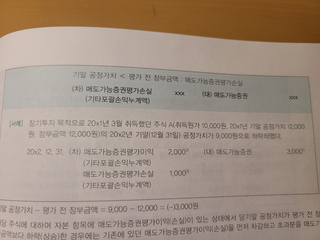 - 양도소득세세금·세무Q. 매도가능증권 평가시 질문 있습니다1.사진 보시면 매도가능증권평가이익이 차변에 기록되어있는데 평가이익은 자본이잖아요 20x1년 3월 주식 취득원가가 10,000원이고그 해 기말에 공정가치 12,000원이 됐으면 자본의 증가인 대변에 적어줘야 맞는게 아닌가요? 왜 차변으로 갔나요?2. 사진 보시면 20x1년 기말 공정가치 12,000원, 장부금액12,000원 되어있는데 여기서 장부금액 12,000원은 평가 후 장부금액인거죠?