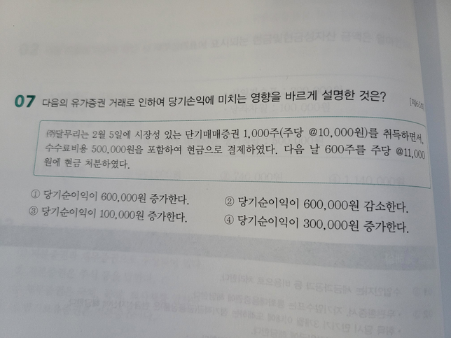 - 양도소득세세금·세무Q. 질문)단기매매증권 질문 있습니다6번에서는 수수료를 빼지 않았는데도 불구하고7번은 왜 수수료를 빼는 것인가요?6번은 수수료 50,000원을 단기매매증권처분손실에서 빼주지 않았는데7번은 수수료 500,000원을 단기매매증권처분이익에서 빼었는데 도대체 왜 이렇게 나오는 거죠?
