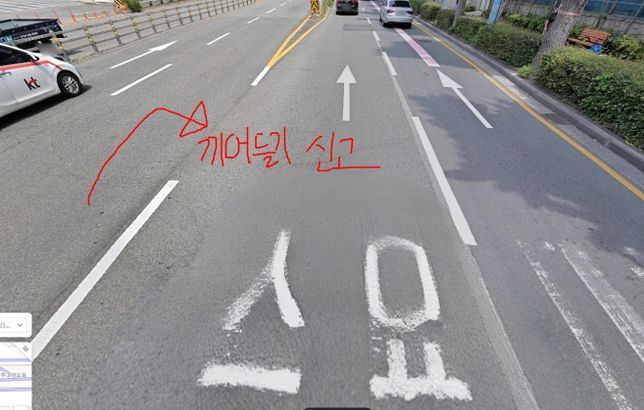 - 생활꿀팁생활Q. 퇴근길 얌체 운전자들 이런 도로의 경우 신고 가능한가요?먼저 사진에는 안 나왔지만 2차선 편도로 되어 있는 터널구간을 나와서 약 100m 지나면 이렇게 4차선으로 도로가 넓어지며 1, 2차선은 고가도로 진입 차선이며 3,4차선은 시내 도로로 가는 구간 입니다. 그래서 시내 구간으로 가려면 미리 3,4차선으로 차선 변경을 해야 합니다.퇴근때 보면 항상 2차선으로 주행하다가 미리 차선 변경을 하지 않고 사진의 빨간 위치에서 얌체같이 끼어들기를 하는 분들이 계시던데, 그렇게 되면 터널 통과 하고 미리 3,4차선으로 차선을 변경한 분들은 이런 얌체 운전자들 때문에 기다려야 하는 상황이 발생합니다. 특히 전방에 신호가 짧아서 기다려야 하는 시간은 더 길어지죠. 누군들 퇴근시간 때 차막히는 거 알고 보살마냥 기다리는 것을 좋아할까요? 그런데도 불구하고 사과 하나 없이 뻔뻔하게 자기 갈길 가는 모습이 너무 화가나는데 어떤 법규 위반으로 신고를 하는게 좋을까요?
