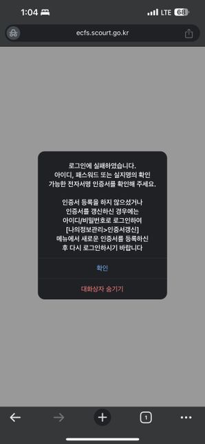 - 민사법률Q. 전자소송 홈페이지 아이디 로그인 오류해결방법전자소송 홈페이지에 로그인하려고 하는데 사진과 같이 계속 동일한 오류가 뜨네요 인증서를 등록하려고 해도 로그인이 안 되는데 뭐 어떻게 하라는건지..