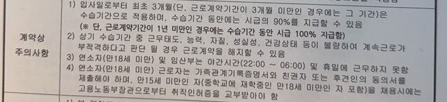 - 근로계약고용·노동Q. Cu 편의점 야간 아르바이트 문의합니다시급:10,030원 최저시급. 근로:평일 오후 11시~오전 9시까지 근로계약서 작성함(근데 휴게시간 칸이랑 근로시간 칸이랑 이것저것 야간수당 칸 이런것들은 체크 안되어있고 그냥 사장님이 체크하라고 하는 칸에만 체크 하고 종이 가져가셨습니다. 사본 받지 못함)찾아보니 8시간 이상이면 법적으로 휴게시간이 1시간 빠진다고 알고있는데 솔직하게 야간이고 유동인구가 적은 곳이라 새벽에는 네다섯명 이렇게 옵니다.그래도 휴게시간은 제가 따로 어딜 가거나 휴게공간에서 휴식을 취해야 하는 것 아닌가요?법적으로 들어간다고 해도 카운터에 계속 앉아있어야 하는데 어떻게 계산되는건가요?궁금한것1.근로계약서도 그냥 쓰라는곳에 쓰고 근로시간,휴게시간, 등등 다른 칸은 적혀있지 않았음.(통장사본도 받지 못함)2.하루 10시간 근로하니 휴게시간 1시간이 법적으로 포함된다면 그거에 대한 휴게는 제가 휴게실에서 하는것도 아니고 카운터를 벗어나지 못하는데 시급으로 그냥 못받는지 궁금합니다3.4대보험이 필수인가요?주 50시간 근무(휴게시간 빼면 45시간)월 급여 대략 평균 2204.처음에 수습기간은 따로 말씀 안해주셨는데 근초계약서 상에는 이렇게 적혀있었습니다.만약 한두달 하고 일이 있어 그만둔다고 말씀 드리면 수습기간이라고 90%만 줘도 법적으로 문제가 없나요?
