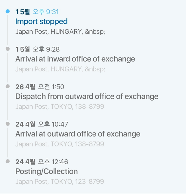 - 무역경제Q. 일본 현지 딜러에게 물건을 구매하였는데 IMPORT STOPPED일본에서 한국으로 물건을 주문하였고, 잘 오는듯 싶다가 갑자기 헝가리에 가 있더니 Import stopped 상태로 변경되었습니다. 헝가리에는 왜 가있는지, 진행상황에 문제가 생긴건지 궁금합니다.주문한 물건은 수건입니다.