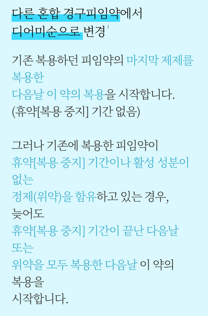 - 약 복용약·영양제Q. 피임약을 교체하려는데 약의 개수가 달라요, 어떻게 해야하죠?센스데이 21정을 장기 복용했습니다16번째 정제를 복용 후, 약을 잃어버려 약국에 갔더니 센스데이가 없다고 디어미 순을 주셨습니다집에 와서 뜯어보니 28정이네요이 경우에는 도중에 약을 교체할 경우 어떻게 복용해야 하나요? 사진 속 설명대로라면 센스데이를 재구매 하여 21알을 맞춰 복용 후 디어미 순을 복용하는게 맞나요?휴약기 없이 지금부터 디어미순을 계속 복용해도 괜찮나요?