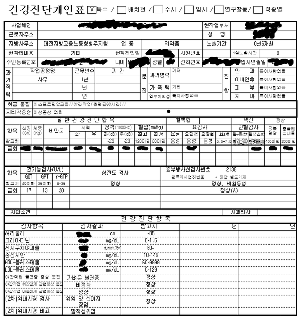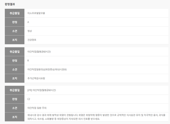 - 의료 보험보험Q. 보험을 새로 가입하려 하는데 1년 이내의 추가 검사로 보험사에 고지해야하나요?올해 3월에 회사에서 건강검진을 받았는데 4월에 추가로 야간작업 항목에 대하여 병원에 내원하여 위내시경을 받았습니다. 대한산업보건협회에서 건강진단개인표를 보내줬고 아래와 같이 3월에 받은 건강진단과 4월의 위내시경이 같이 나와있습니다.대한산업보건협회에서 확인할 수 있는 판정결과에 아래와 같이 나왔는데 제가 보험을 새로 가입하려면 이 사항을 고지해야하나요?