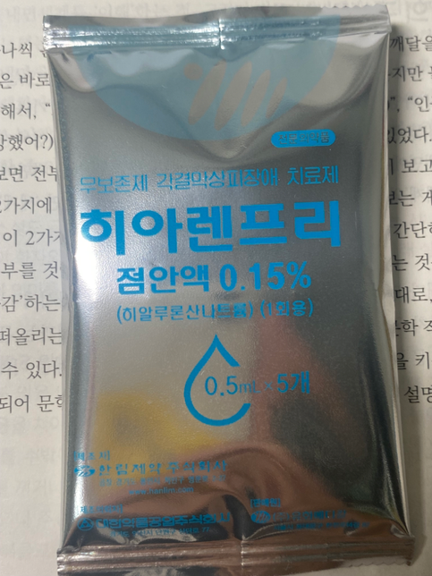 - 약 복용약·영양제Q. 히아렌프리 결막염에 써도 되나요?친구가 집에 많다고 좀 줬는데 제가 마침 결막염이 요즘 올라오고 있어서 병원을 가려던 찰나에 이걸 받아서 좀 많이 가려울 때 쓰려고 하는데 결막염에도 도움이 되나요? 안 되면 그냥 안 쓰고 병원 가려구요 아니면 결막염에 도움은 안 되지만 인공눈물처럼 써도 되는 건가요?