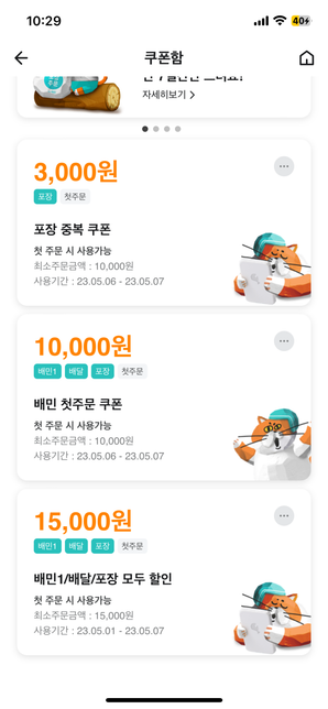 - 생활꿀팁생활Q. 저기 배민쿠폰에 대해서 질문드립니다.10000원 쿠폰이랑 15000원 쿠폰이 있는데요 10000원 짜리 쿠폰을 첫주문 때 사용 하면 다음 주문에서는 15000짜리 쿠폰을 사용 할 수 없나요??