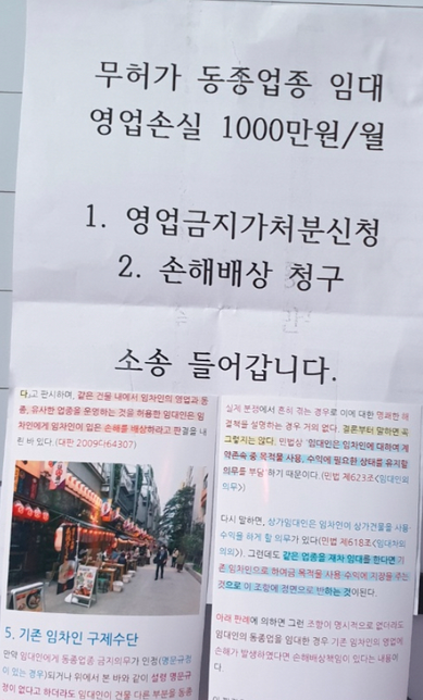 - 기업·회사법률Q. 한 건물 내 동종 업계를 임대할 경우 문제가 되나요?안녕하세요.건물주가 한 건물에 동종업계를 임대하는 경우, 문제가 될 수 있나요?? 6층짜리 건물 6층에 카페가 있었고, 임대인의 허락 하에 5층을 임대하여 운영하고 있습니다(계약 전 6층에 카페 있는데 임대 가능한지 확인 후 임대함). 그런데 6층에서 매출이 떨어진다면서 5층 엘레베이터 앞에 아래와 같은 내용을 붙여놨습니다.1. 임대인이랑 얘기할 부분인 것 같은데, 이러는건 어떻게 대처 가능할까요? 2. 그리고 임대인은 이런 경우 손해를 배상해 줄 의무가 있는걸까요?