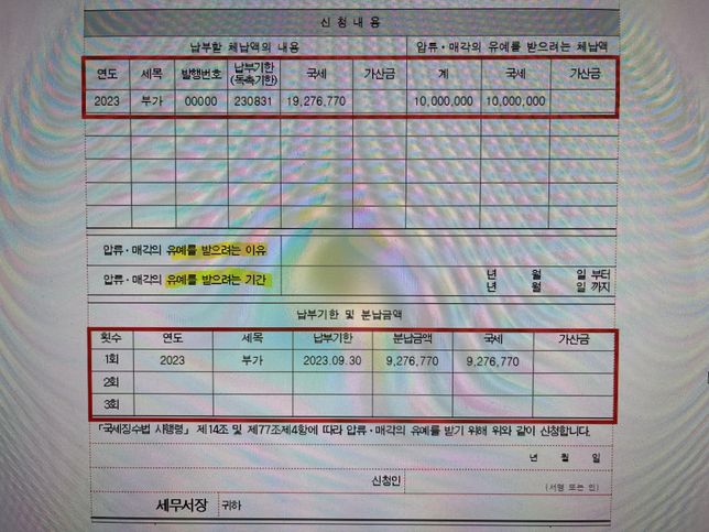 - 부가가치세세금·세무Q. 부가세 체납으로 홈택스 압류 매각 유예 신청서 작성 방법(사진참조)안녕하세요, 사진과 같이 국세가 전체 체납금액이고 오른쪽에 계 부분과 국세 부분에 10,000,000원은 어떤 의미인가요? 천만원 금액을 한달뒤에 내겠다는 뜻인가요? 아니면 천만원을 지금 내겠다라는 뜻인가요?