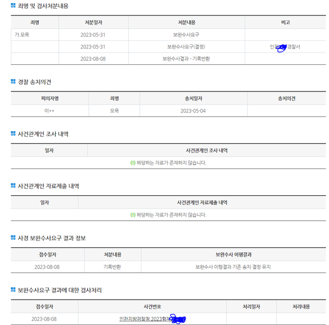 - 명예훼손·모욕법률Q. 보완수사 이행결과 기존 송치 결정 유지모욕으로 고소를 하였고, 불송치 결정을 받은 뒤 이의 신청을 하여 검찰에 송치되었습니다.이후 보완수사 명령이 내려왔고 경찰에서 보완 수사를 진행한 뒤 경찰에서 검찰로 기록 반환이 되었는데요..'보완수사 이행결과 기존 송치 결정 유지'라고 뜨며 새로운 2023형제 사건 번호가 생겼습니다.이런 경우는 단순히 '보완 수사가 내려지면 경찰은 다시 검찰로 기록 반환을 해야 하는데 그 과정에서 기계적으로 생기는 문구 이며 보완 수사 결과는 담당 수사관 밖에 모른다'라고 봐야 할까요? 아니면 '맨 처음 결정한 불송치 결정과 같다' 라는 뜻인가요?