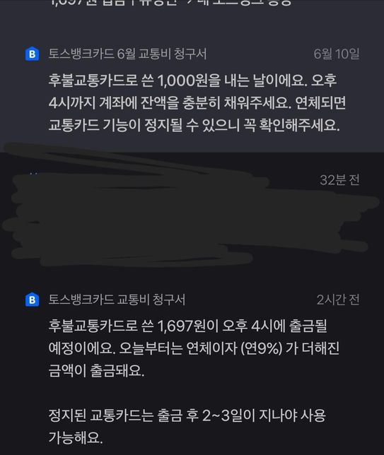 - 생활꿀팁생활Q. 저는 교통 카드 후불 쓴적 없는데 계속 내라 하네요안녕하세요 질물 있는데 갑자기 오늘 연체된 후불 내라 하는데 왜 그럴까요 생각 해보니까 5월 쯤에 편의점 교통카드 잔액 없어서 토스 카드에 통정 0원 인데 1000원 입금 하고 버스 찍으면서 잔액이 4000원 남은거 있어서 토스 회사에서 줬나 생각 하고 그걸로 몇번 버스비 냈습니다 이거 때문 인가요