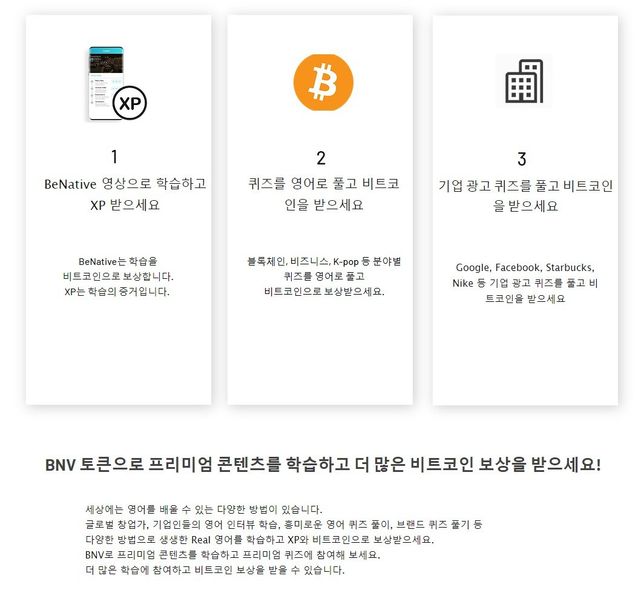 - 생활꿀팁생활영어 공부에 대한 보상을 주는 토큰도 있나요?A. 안녕하세요. 영어 공부와 관련된 블록체인 컨텐츠에 대하여 답변드리겠습니다.비네이티브(BeNative)비네이티브는 다양한 영어 학습 컨텐츠를 이용하고 비트코인 보상받을 수 있게 됩니다.장점모든 컨텐츠는 현지인의 영어로 이루어져 있으며 영어회화 기초부터 직장인 면접, 프리젠테이션, 고급 과정까지 개인의 눈높이에서 체계적으로 학습할 수 있습니다 .열심히 학습하면 학습에 따른 보상을 받을 수 있다는 점입니다. 비네이티브는 학습자분들께 비트코인으로 보상받을 수 있는 다양한 기회를 제공해드리고 있습니다.계속 새로운 서비스가 추가되고 있다는 점입니다. 대표적인 예가 BNV 토큰과 함께 시작된 BeNative 영어 퀴즈 대회입니다.비네이티브 홈페이지 : https://www.benative.io/?lang=ko감사합니다.