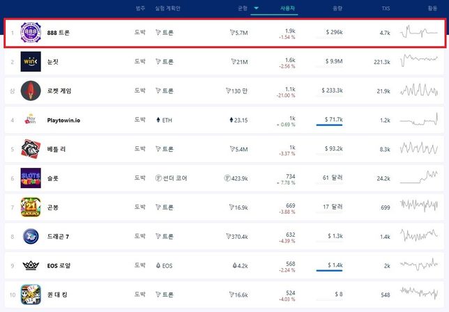 - 생활꿀팁생활겜블댑중에 이용자수가 많은 댑은 무엇인가요?A. 안녕하세요. 가장 많은 갬블댑에 대하여 답변드리겠습니다.댑레이더(Dappradar) 기준 블록체인 갬블댑중 가장 많은 이용자 수를 확보한 댑은 트론(TRON)의 "888TRON" 겜블댑 입니다.888TRON 댑 유저수 : 1,900명겜블댑 이용자 수 기준 10위권 내에 7개는 트론 기반의 겜블댑이 차지하고 있습니다.감사합니다.