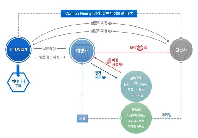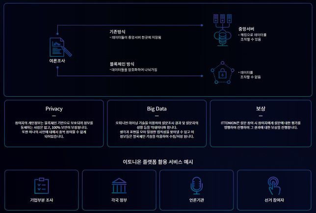 - 생활꿀팁생활설문조사에 블록체인 기능을 입힐 수 있나요??A. 안녕하세요. 블록체인 기반의 설문조사에 대하여 답변드리겠습니다.이토니온(Ittonion)이토니온은 블록체인 기반으로 운용되는 설문 및 여론조사 정보 오픈 플랫폼 입니다.이토니온의 특징업의 입장에서는 저렴한 비용으로 설문을 진행할 수 있습니다.패널들의 접근성과 신뢰도가 높일 수 있습니다.설문에 대한 보상을 받을 수 있습니다.나이, 성별 등을 특정해 선별된 패널들에게만 설문을 제공할 수 있어 신뢰도 있는 결과를 얻는 것도 가능합니다.보상 수단인 ITT토큰은 ERC-20토큰 규격을 사용하게 됩니다.이토니온 홈페이지 : https://www.ittonion.com/감사합니다.