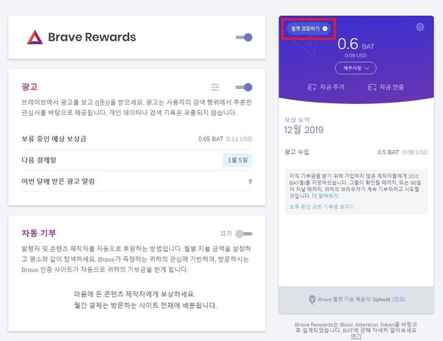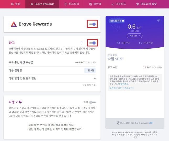 - 생활꿀팁생활브레이브 브라우저로 광고를 구독하면 BAT를 보상 받을 수 있다고 하는데, 가입없이 되는걸까요?A. 안녕하세요. 브레이브 브라우저의 토큰 보상방법에 대하여 답변드리겠습니다.브레이브 브라우저 주소에 chrome://rewards/를 입력한 후 이동하면 브레이브 리워드 메뉴 페이지로 이동하게 됩니다. 이 때 Brave Rewards 설정을 활성화 한 후 바로 아래에 있는 광고 버튼도 활성화 시킵니다.활성화된 상태에서 대기(인터넷 서핑)을 하다보면 브레이브 브라우저에서 광고 알림이 발생하게 되는데요. 이 때 해당 알림을 끌릭하여 접속하면 0.1BAT정도의 토큰을 획득할 수 있게 됩니다.받은 토큰을 활용하기 위해서는 월렛 제조사인 uphold라는 월렛검증(회원가입)을 해야 합니다.감사합니다.