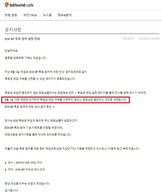 - 생활꿀팁생활빗썸거래소는 이오스 bp몇위에 위치하고 있나요?A. 안녕하세요. 빗썸거래소의 이오스 BP에 대하여 답변드리겠습니다.빗썸 거래소에서 실시하는 이오스투표는 빗썸이 직접 BP노드를 운영하는 것이 아니라 빗썸 거래소 내부에 있는 이오스 토큰을 다른 BP노드에 위임(프록시) 투표를 지원하는 것을 말합니다.이와 관련된 빗썸의 공지사항 및 위임투표 메뉴의 모습을 아래와 같습니다.빗썸의 프록시 투표 결정 유무는 계정관리 → 회원정보 관리 → 투표권 위임 설정에서 하게 되며 설정 후에는 저장 하시면 됩니다.감사합니다.