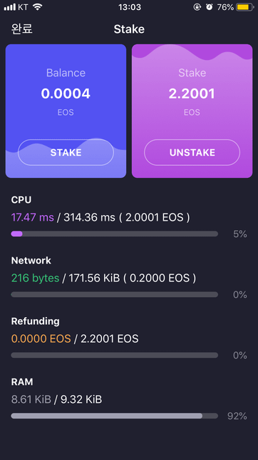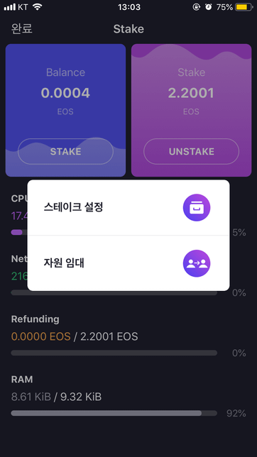 - 생활꿀팁생활이오스 지갑에서 스테이킹 하는 방법은?A. 안녕하세요. 이오스의 자원과 투표에 대하여 답변드리겠습니다.이오스에서 제공되는 게임 뿐만 아니라 에어드랍, 트랜잭션, 메시지 전송 등에 CPU, RAM, Network라는 자원을 활용하게 됩니다. 이런 자원은 블록체인 네트워크의 자원을 얼마나 확보(점유율:%) 할 수 있느냐에 따라 원할한 서비스 제공을 할 수 있게 됩니다.이런 자원은 주로 서비스를 제공하는 댑사와 직접적으로 관련이 되어 있으며, 블록체인 네트워크에 사용자가 몰려 과부화가 발생했을 경우 자원을 얼마나 확보할 수 있느냐에 따라 이오스 블록체인 네트워크 사용 보장 유무가 달라지게 됩니다.이오스 자원의 역할CPU : 블록체인 네트워크에서 발생되는 댑(DApp) 실행 및 트랜잭션 등 데이터의 연산능력을 말합니다.RAM : 블록체인 네트워크에서 실행되는 여러 데이터들이 일시적으로 저장되는 공간을 말합니다.NETWORK : 블록체인 시스템에서 실행되는 데이터의 처리량을 말합니다.쉽게 설명해서 이오스 블록체인 서비스를 이용함에 있어 사용되는 컴퓨터 사양이라고 생각하시면 됩니다. 숫치가 높을 수록 많은 양의 데이터를 처리할 수 있는 원리와 같습니다.스테이킹 양은 사용하기에 따라 달라질 수 있지만 각 0.5 ~ 1이오스만 스테이킹 해도 충분하게 사용하실 수 있으실 겁니다.스테이킹 방법은 지갑마다 조금 다르지만 이오스 전용 지갑인 "노바" 를 기준으로 설명드리겠습니다.사전에 이오스를 보유하고 있어야 하며 프라이빗키가 해당 지갑에 등록되어 있어야 합니다.좌측 "STAKE" 항목을 클릭합니다."스테이크 설정" 항목을 선택 합니다.원하시는 자원에 필요한 양 만큼 지정하여 "완료" 버튼을 클릭하면 스테이킹이 완료됩니다.감사합니다.