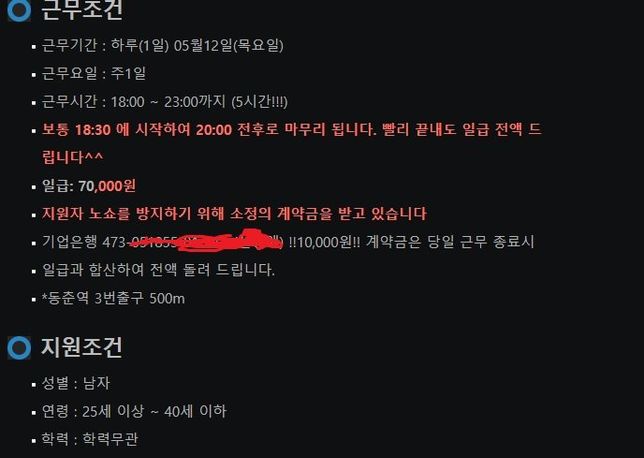 - 임금·급여고용·노동Q. 일용직알바 구하는데 노쇼방지 계약금??알바사이트에서 일용직 알바를 구하는데 알바한다고하고 안나오는 사람이있으니까 계약금으로 1만원보내면 끝나고 급여보낼때 같이보낸다는 내용인데회사주소 본인 핸드폰번호, 계좌 올리고 업체 홈페이지도 있고 실제로 회사도 로드뷰해보니 있긴한데만약 사기가 아니고 진짜라고 하더라도 이래도되는건가요? 노동청에 신고하면 처벌 받게 할 수 있나요?
