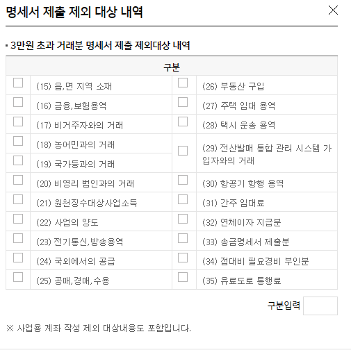 - 종합소득세세금·세무Q. 공과금 납부시 명세서제출제외대상 문의드려요상하수도요금 납부내역과 삼천리 납부내역, 한국전력공사에서의 내역을 받았습니다.각각 명세서 제출제외대상에서 19.국가등과의 거래를 해야하나요?어떤걸 클릭해야하는지 구분 부탁드립니다..