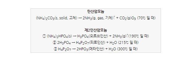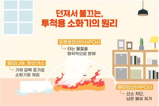 - 생활꿀팁생활'투척용소화기' 안에는 물같은거?어떤성분으로 되어있나요??A. 안녕하세요. 자드락비입니다.투척용 소화기에는 탄산암모늄, 제2인산암모늄 등의 성분이 담긴 소화약제가 담겨있습니다. 우선, 투척용 소화기를 불에 던지면 통이 깨져야겠죠? 이 통을 터트릴 때 탄산암모늄이 큰 역할을 합니다. 탄산암모늄 수용액은 70℃에서 암모니아, 탄산가스, 물로 분해되는데요. 암모니아, 탄산가스가 통 안에 가득 차면 압력이 커져 결국 통이 깨지고, 불에 타지 않는 불연성 가스인 이 두 가스가 산소 공급도 차단해 불을 진압하는 효과가 있습니다.제2인산암모늄은 190℃, 215℃, 300℃ 이상에서 여러 가지 열분해 반응을 하는데요. 이때 불연성 가스인 암모니아와 수증기가 더 많이 생기게 되고, 함께 생성되는 오르쏘인산(h3po4)은 타는 물질인 목재, 섬유, 종이 등을 탈수, 탄화 시켜서 탄소와 물로 분해해 더 이상 타지 않도록 화학반응을 합니다. 이후, 오르쏘인산은 화학적으로 가장 안정된 메타인산(HPO3)이 되는데요. 이 메타인산은 타는 물질 위에 유리상의 피막을 만들어 산소를 차단, 남아있는 불씨까지 끄게 됩니다.투척용 소화기 안에 들어있는 약제는 액체이기 때문에 굳지 않아 보관과 관리가 쉽다는 장점이 있습니다.또, 위급 상황에서 화재 현장에 그냥 던지기만 하면 되기 때문에 사용하기도 편리해서 어린이집, 경로당의 노약들도 쉽게 쓸 수 있습니다. 소화기 모양도 꽃병, 액자 등 인테리어 소품처럼 디자인된 제품들이 있어서 집안 곳곳에 놓아도 미관을 해치지 않기도 합니다.출처 : https://post.naver.com/viewer/postView.nhn?volumeNo=29916273&memberNo=41226869&vType=VERTICAL