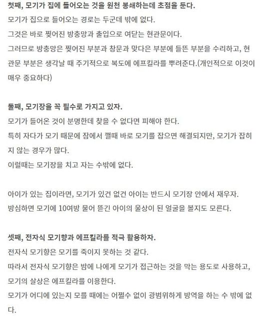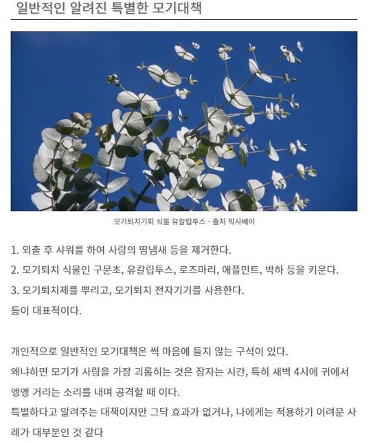 - 생활꿀팁생활여름이 오긴 오나봐요...모기 대책 알려주세요.A. 안녕하세요. 자드락비입니다.[모기 예방 기피 퇴치 방법]출처 : https://cosmos9763.tistory.com/16