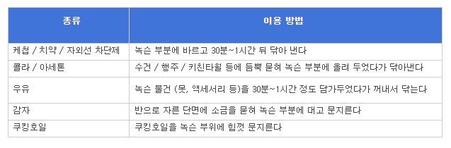 - 생활꿀팁생활의자등받이쪽 철이 녹슬어있어요A. 안녕하세요. 자드락비입니다.간편한 녹 제거 방법! 케첩, 콜라, 아세톤을 이용해보세요!1. 콜라우리가 즐겨 마시는 음료 중 하나인 콜라! 이 콜라로 녹을 제거할 수 있다고 하는데요. TV프로그램에서도 자동차에 생긴 녹을 콜라로 제거하는 방법이 소개된 적이 있었죠.콜라는 탄산과 인산이 혼합되어 있는 약산성 물질로. 이것이 산화된 부분의 산소와 반응하면서 이 산소를 제거하는 원리로 녹이 제거됩니다.수건에 콜라를 듬뿍 묻힌 다음, 녹이 슨 부분을 닦아 보았는데요. 어느 정도 녹이 없어지는 것을 확인할 수 있었습니다. 확인 결과, 콜라로 녹 제거 효과를 얻기 위해서는 녹의 정도에 따라 10~30분 정도 녹슨 물건을 담가 두거나 녹슨 부위에 적셔 두는 것이 좋다고 하니, 참고해 주세요! 2. 토마토 케첩식품 중에서 녹을 제거하는 것으로 알려진 가장 대표적인 것은 바로 토마토입니다. 토마토에 함유된 ‘라이코펜’이라는 물질 속의 유기산이 녹을 제거하고 산화를 방지하는 역할을 하기 때문인데요. 물론 토마토를 이용해도 되지만, 그보다 토마토 케첩이나 토마토 주스를 이용하면 훨씬 더 간편하게 녹을 제거할 수 있다는 사실!토마토 케첩, 혹은 토마토 주스를 녹이 슨 부위에 바르고 30분 정도 두었다가, 수건으로 닦아내거나 철 수세미로 문질러 줍니다.과연 그 결과는? 전과 비교하여 녹이 무척 깨끗하게 제거되었습니다! 그렇게 힘을 들이지 않았는데도 녹이 쉽게 닦여 나가는 것을 확인할 수 있었는데요. 단 케첩의 달콤한 냄새가 남을 수 있으니, 케첩으로 녹을 제거한 다음 물수건 등으로 한 번 더 닦아 주면 냄새까지 완전히 제거할 수 있다는 사실!토마토 케첩, 이제 먹지 말고 녹 제거에 양보해야겠네요. 3. 아세톤그렇다면 식품 종류 말고, 다른 물건 중 녹을 제거하는 데 효과적인 물건은 없을까요? 인터넷 폭풍 검색 결과, ‘아세톤’이 녹 제거에 효과가 있다는 정보를 입수했습니다.매니큐어를 지우는 데 사용되는 아세톤은 화장품 전문점이나 마트 등에서 비교적 쉽게 구할 수 있는 물건 중 하나인데요, 이 아세톤 역시 녹을 제거하는 데 효과가 있다고 하여, 직접 녹 제거를 시도해 보았습니다.아세톤을 수건에 듬뿍 묻힌 다음, 녹을 닦아 보았는데요, 어느 정도 녹이 닦이는 것을 확인할 수 있습니다. 콜라와 마찬가지로 아세톤 역시 천에 듬뿍 적신 후 녹슨 부위에 10~30분 정도 얹어 두었다가 닦아 내면 효과가 더 좋다고 하네요!출처 : https://newsroom.posco.com/kr/%EA%B0%84%ED%8E%B8%ED%95%9C-%EB%85%B9-%EC%A0%9C%EA%B1%B0-%EB%B0%A9%EB%B2%95-%EC%BC%80%EC%B2%A9-%EC%BD%9C%EB%9D%BC-%EC%95%84%EC%84%B8%ED%86%A4%EC%9D%84-%EC%9D%B4%EC%9A%A9%ED%95%B4%EB%B3%B4%EC%84%B8/