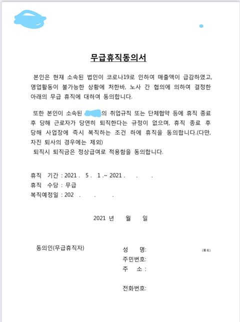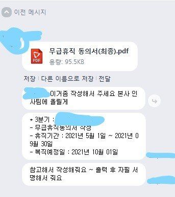- 휴일·휴가고용·노동Q. 5월~10월까지 무급휴가 동의서 작성하지않고 퇴사시 실업급여가능할까요?5월~10월까지 무급휴가 동의서 작성하지않고 퇴사시 실업급여가능할까요? 이렇게 연락이 왔는데요. 실업급여 받을수있을까요?? 참고로 이전에 무급휴가동의서를 작성했고 정부지원금을 받고 있었습니다. 5월부터는 정부 지원금도 안나온다는데요. 아 그리고 퇴직금은 어떻게 정산되나요?? 최근 3개월은 회사에서 무급 정부지원금만 받았습니다.