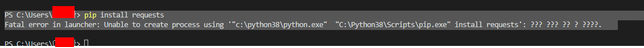 - 생활꿀팁생활Q. 비쥬얼 스튜디오 파이썬 오류 질문사항비쥬얼 스튜디오 파이썬 오류 질문사항 질문드립니다.아래 메시지가 뜨는 이유가 무엇일까요 ...?PS C:\Users\내컴퓨터> pip install requestsFatal error in launcher: Unable to create process using '"c:\python38\python.exe" "C:\Python38\Scripts\pip.exe" install requests': ??? ??? ?? ? ????.