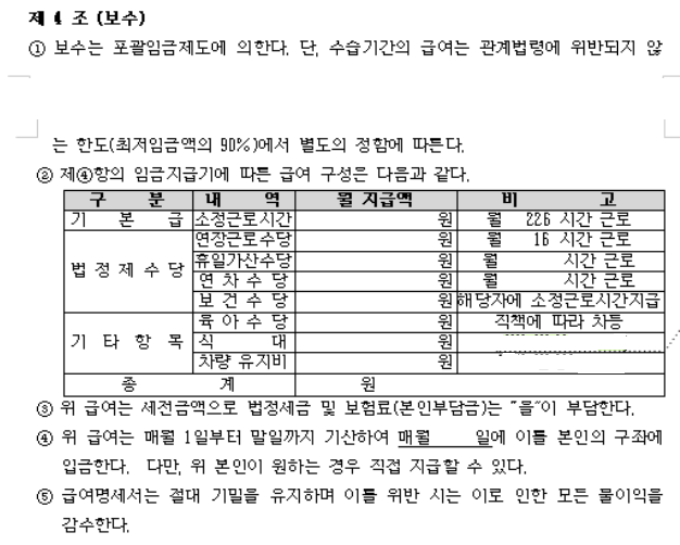 - 임금·급여고용·노동Q. 통상임금 산정에 반영되는 임금항목 문의안녕하세요.어린이집 보육교사에 대하여 근로계약을 체결시 아래와 같은 근로계약서를 작성, 교부하고 있습니다.아래의 근로계약서의 임금구성 항목중 통상임금 산정시 포함되는 지급항목이 어떤 것들인지 문의를 드립니다.감사합니다.