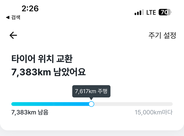 - 생활꿀팁생활타이어 위치 교환은 몇킬로에 하는게 좋은가요?A. 안녕하세요. 언제나 좋은것을 파는 우리쥬쥬입니다.자동차 관리 어플인데요 교환주기 보시면 15000km 명시 되어있습니다.저는 이렇게 관리합니다