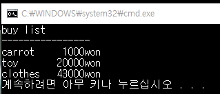 - 생활꿀팁생활C언어 질문입니다 buylist 결과를 내고 싶은데 부탁드립니다!!A. 아래와 같이 작성하시면 됩니다.#include int main(void){ printf("buy list\n"); printf("----------------\n"); printf("carrot 1000won\n"); printf("toy 20000won\n"); printf("clothes 43000won\n"); return 0;}