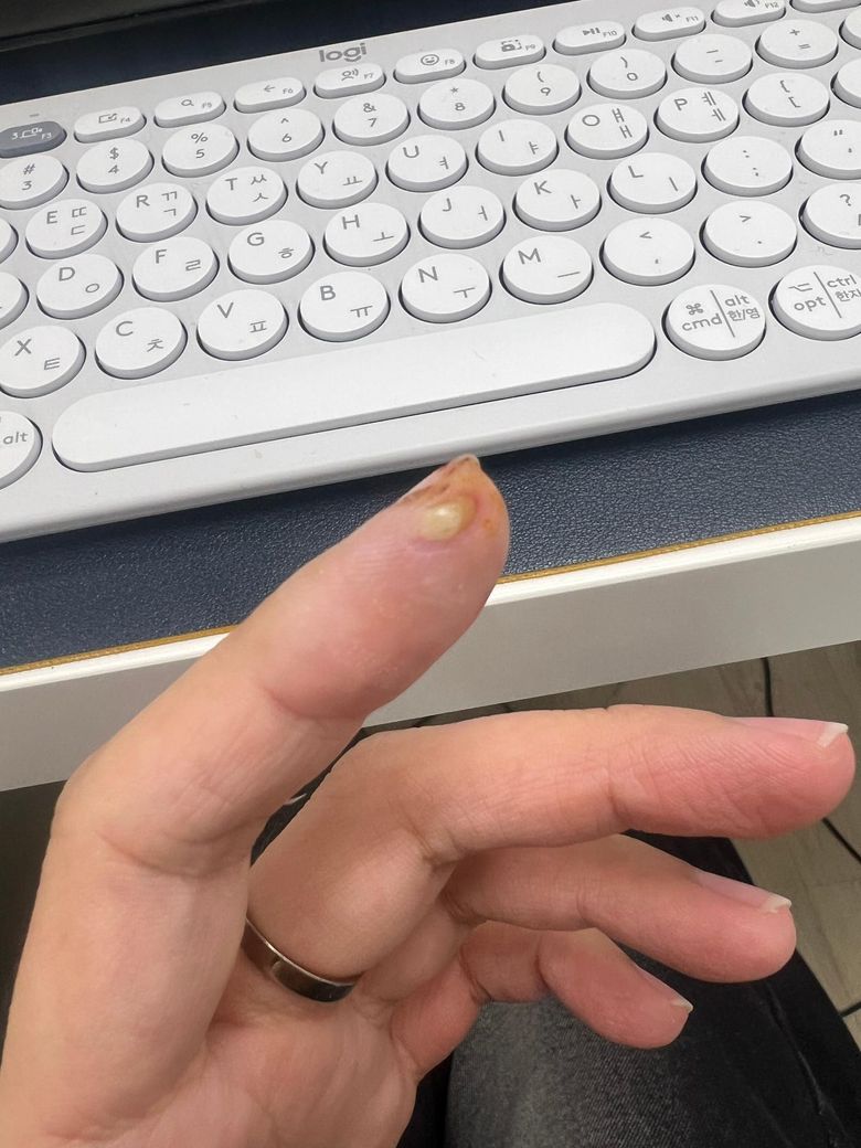 손가락이 빨갛거나 아프진 않습니다(베인 부분을 부딪히면 아픈 정도)