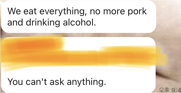"너 고기도 안먹어? 혹시 내가 이런거 물어보는거 실례야?" 라고 물었더니 이렇게 대답이오는데