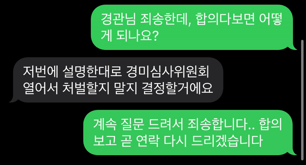 수사관이 첨부된 사진파일과 같이 합의를 하면 선처를 해주겠다고 나서고 있는 상황이니 합의를 반드시하는 방향으로 진행하시기 바랍니다.