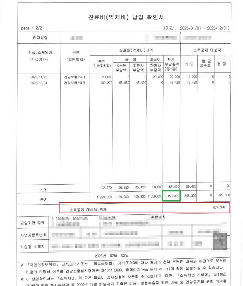 병원에서 진료비 내역을 국세청에 제출하지 않아, 진료비 납입 확인서 발급해줬어요. '소득공제 대상액 총계'와 '환자부담총액' 중 어떤 금액으로 공제서에 반영해야 할까요?