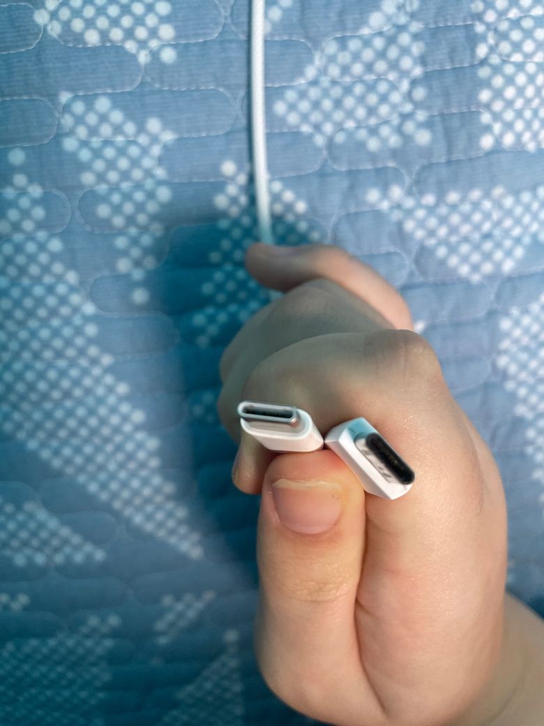 둘 다 같은 c타입 충전기이고 왼쪽은 에어팟 살때 들어있던 정품 애플 c타입 충전기,오른쪽은 어디서 산지도 모르는 c타입 충전기입니다 에어팟 프로2케이스 충전할 때 애플 정품은 꽃으려하면 들어갔다가 손을 놓으면 스프링 처럼 다시 나오고 오른쪽 출처모르는 c타입은 잘 꽃혀서 충전 잘만되는데 왜 그런건가요 에어팟 케이스 충전 부분이 불량인건가요?