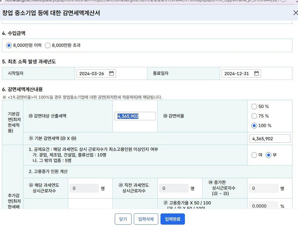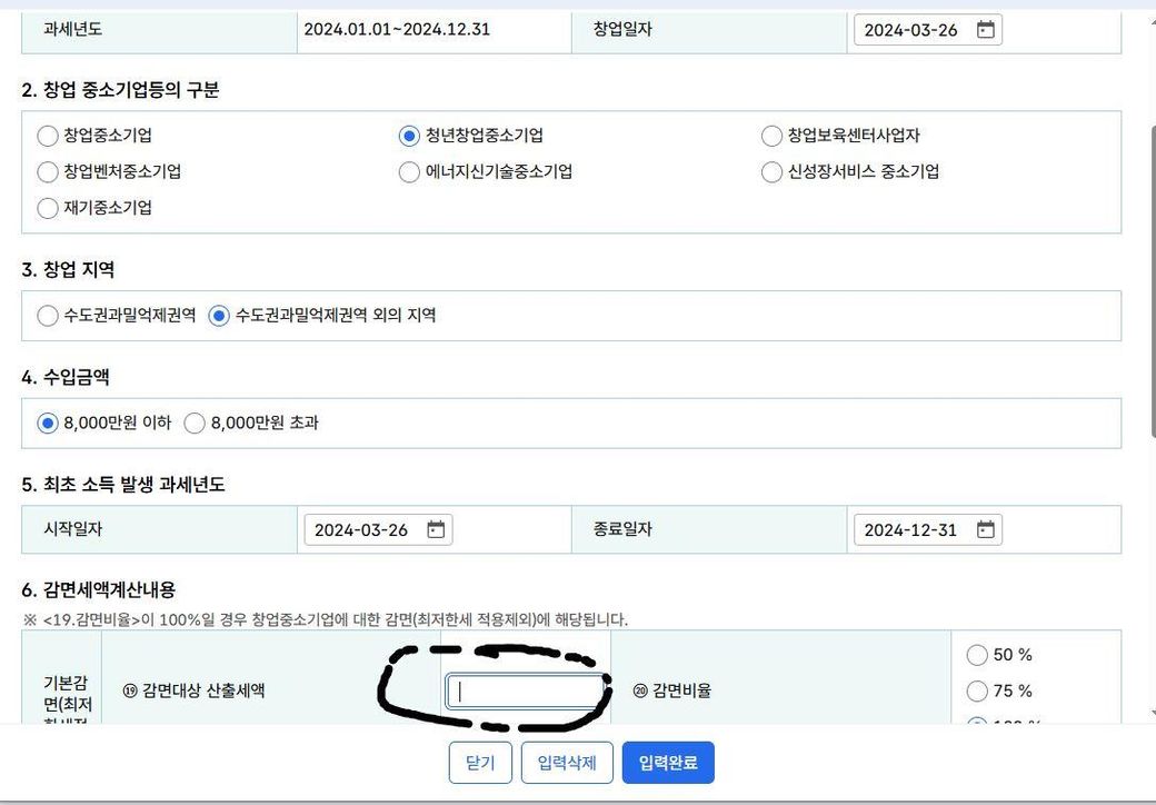 현재 종합소득세를 신고하려고하는데 최초청년창업자라서 사업수익에 대해서는 100% 면제 조건입니다.