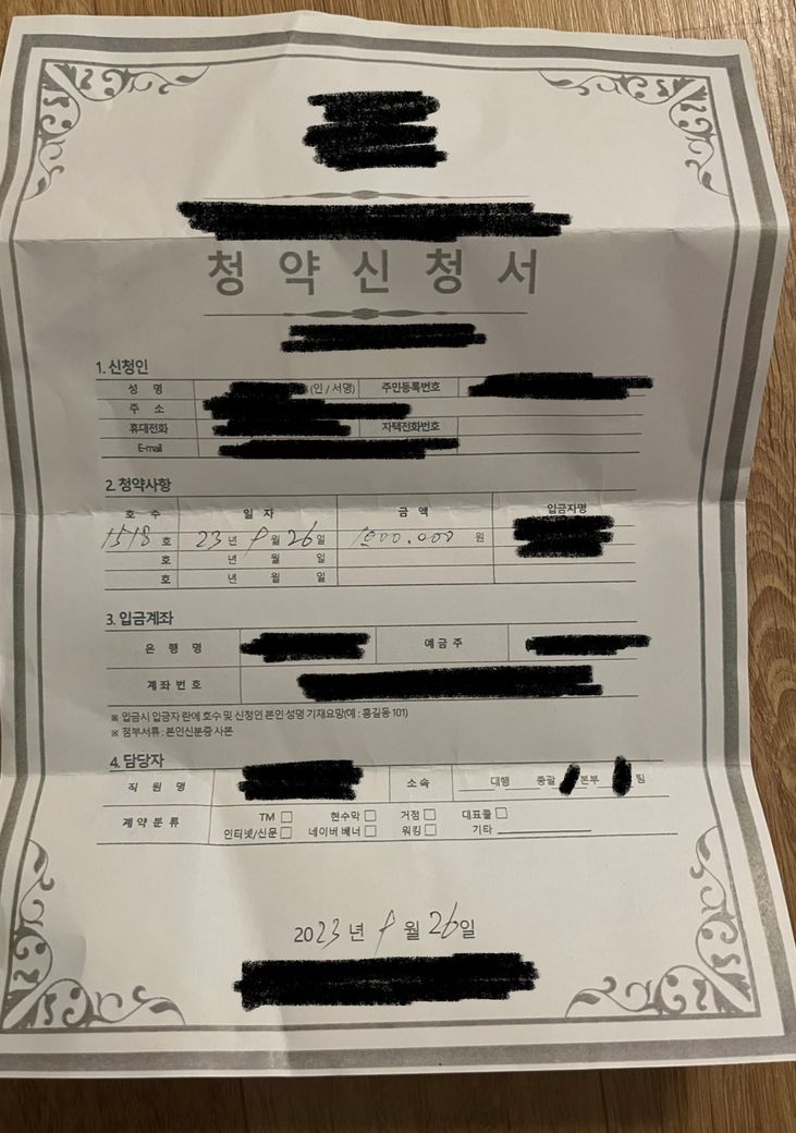 제 인적사항이랑 청약사항(호수, 일자, 입금한 금액), 담당자 정보 정도 적혀있고 계약 사항 같은 내용은 전혀 적혀있지 않는 되게 심플한 구성인데