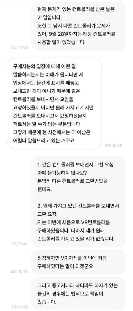 9월 15일, VR 컨트롤러에 이상이 있어 판매자에게 둘 다 교환해달라고 요청하였고 9월 21일 컨트롤러를 받았습니다.