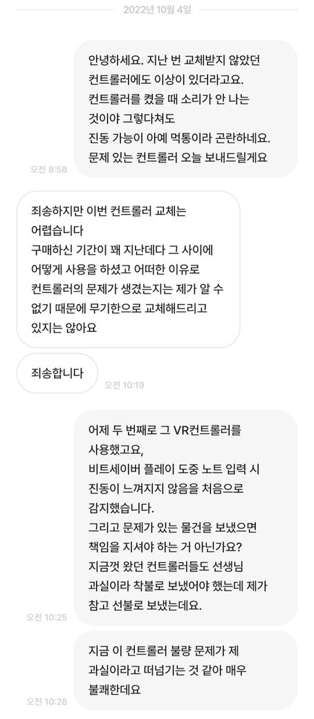 10월 4일 B컨트롤러에 대해 교환을 요청하였으나 거부당했습니다.