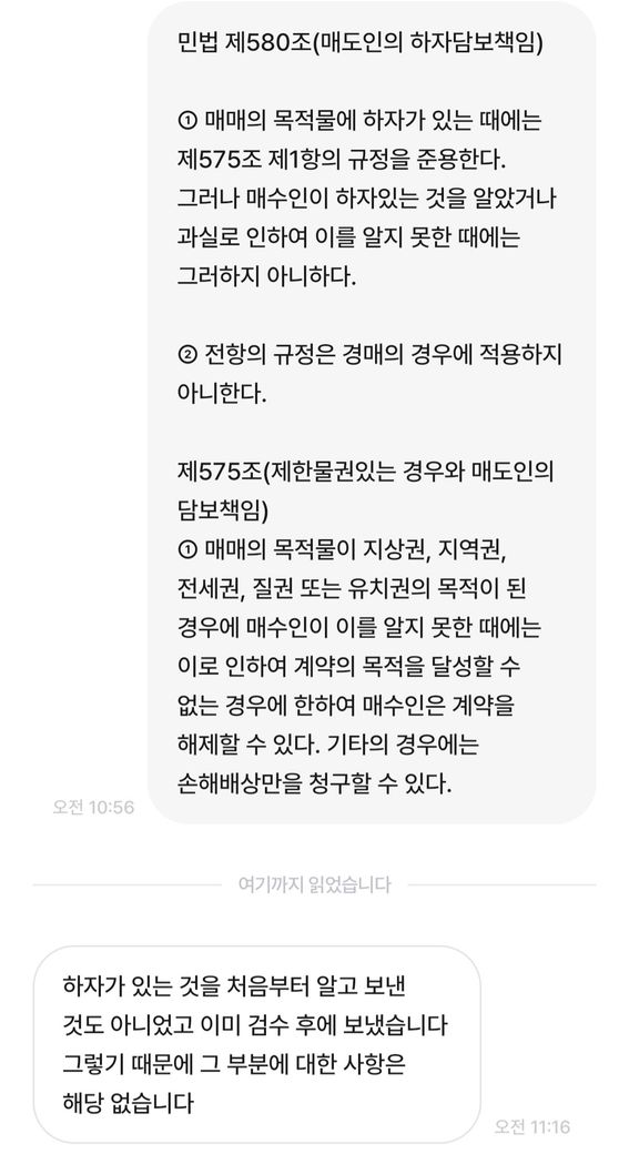 물건의 하자가 발생한 부분에 대해서는 일단 하자가 업는 상품이었음을 판매자가 확인을 해줘야 하는 부분입니다.