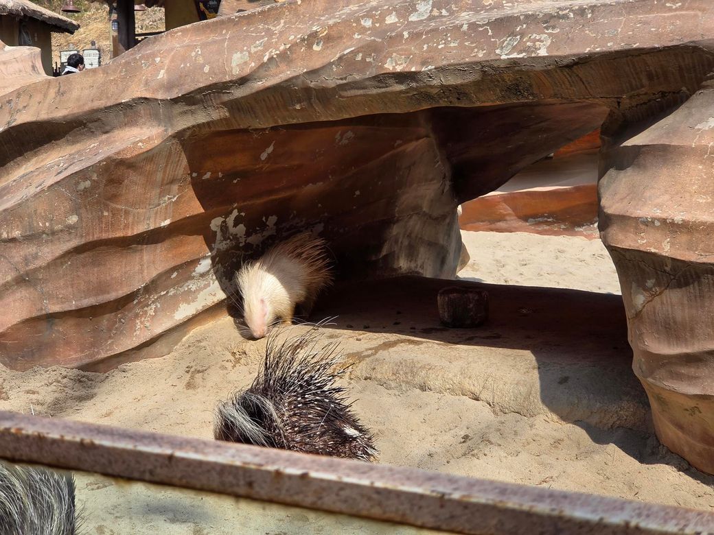 사진 속 포큐파인의 털이 흐니색인 것은 어린 새끼일 가능성이 높습니다. 포큐파인은 태어날 떄 털이 연하고 희거나 회색빛을 띠고, 귀와 피부는 붉은 색을 띠는 경우가 많습니다. 나이가 들면서 털 색이 갈색/검정색으로 짙어지고, 피부색도 진해집니다.