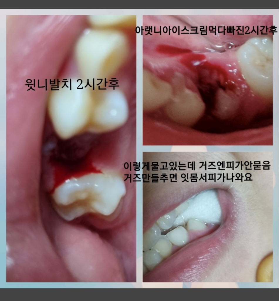 사진1번만 유심히봐주세요.유치발치2시간후에도 저렇게 피가나는데 괜찮은건가요?다른검사를받아봐야될까요..