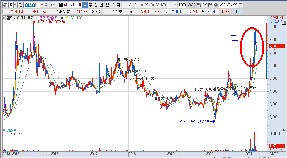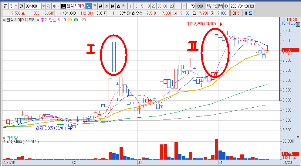 2번의 상한가는 전고점을 뚫어주는 강한 상한가 흐름으로 보이고 거래대금도 많이 터진걸로 보여서 상당히 좋은 형태로 보였지만 이후 흐름이 거래를 죽이면서 횡보하는 흐름이네요.
