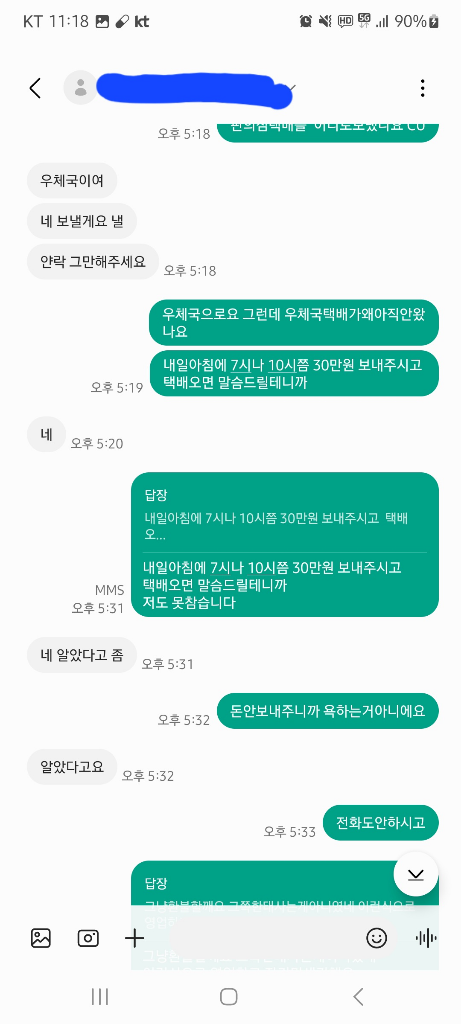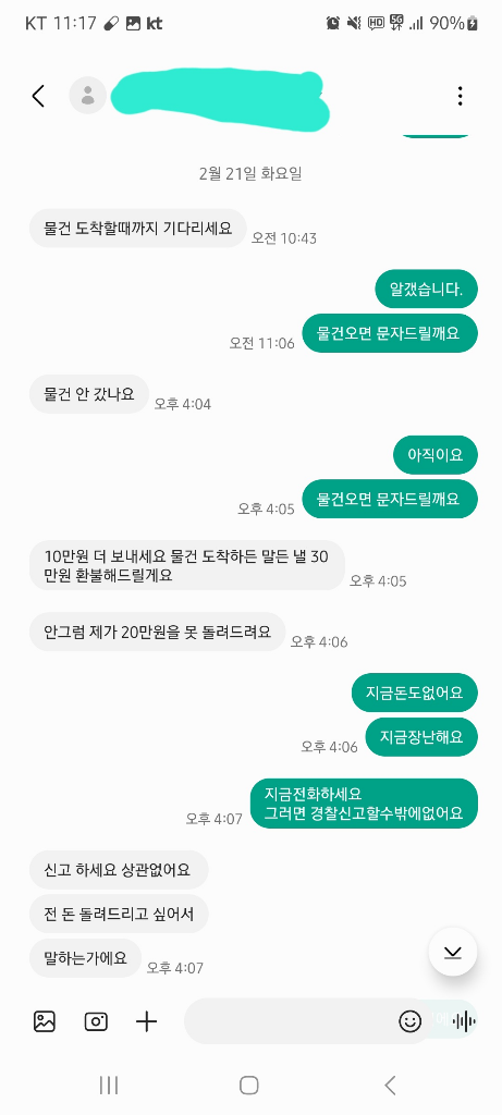 그날 이후로 배송도착 안했냐고 10만원 을 보내달래요