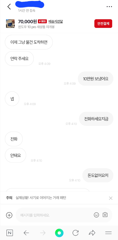 그래서 그날이후로 이사람이(판매자) 저는 사기당한거구나 지구대경찰한태 들은거죠