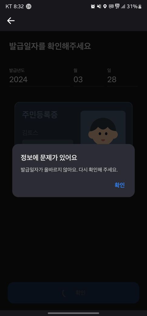 주민등록증 발급일자를 잘못 입력했는지 다시 한번 확인해 보세요. 숫자 하나만 틀려도 인증이 되지 않습니다.